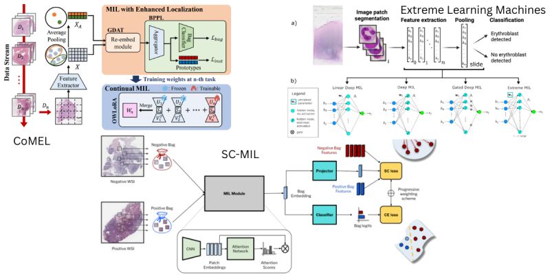 3) Does every task require massive compute? Rajiv Krishnakumar et al. challenge the reliance on heavy backpropagation. They combine attention-based MIL with Extreme Learning Machines—networks that use randomized, fixed weights for part of the architecture. Applied to the detection of circulating rare cells, this reduced the number of trained parameters by a factor of 5 while maintaining AUC within 1.5% of full deep learning models, proving that lightweight architectures can be robust enough for precision screening.